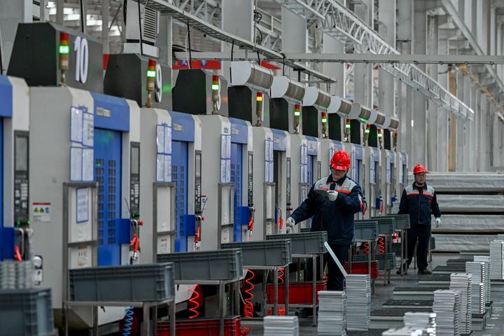 在霍林郭勒市一家輕量化新材料公司廠房內(nèi),工作人員正在加工鋁材料部件?!∮浾摺∵B振 攝