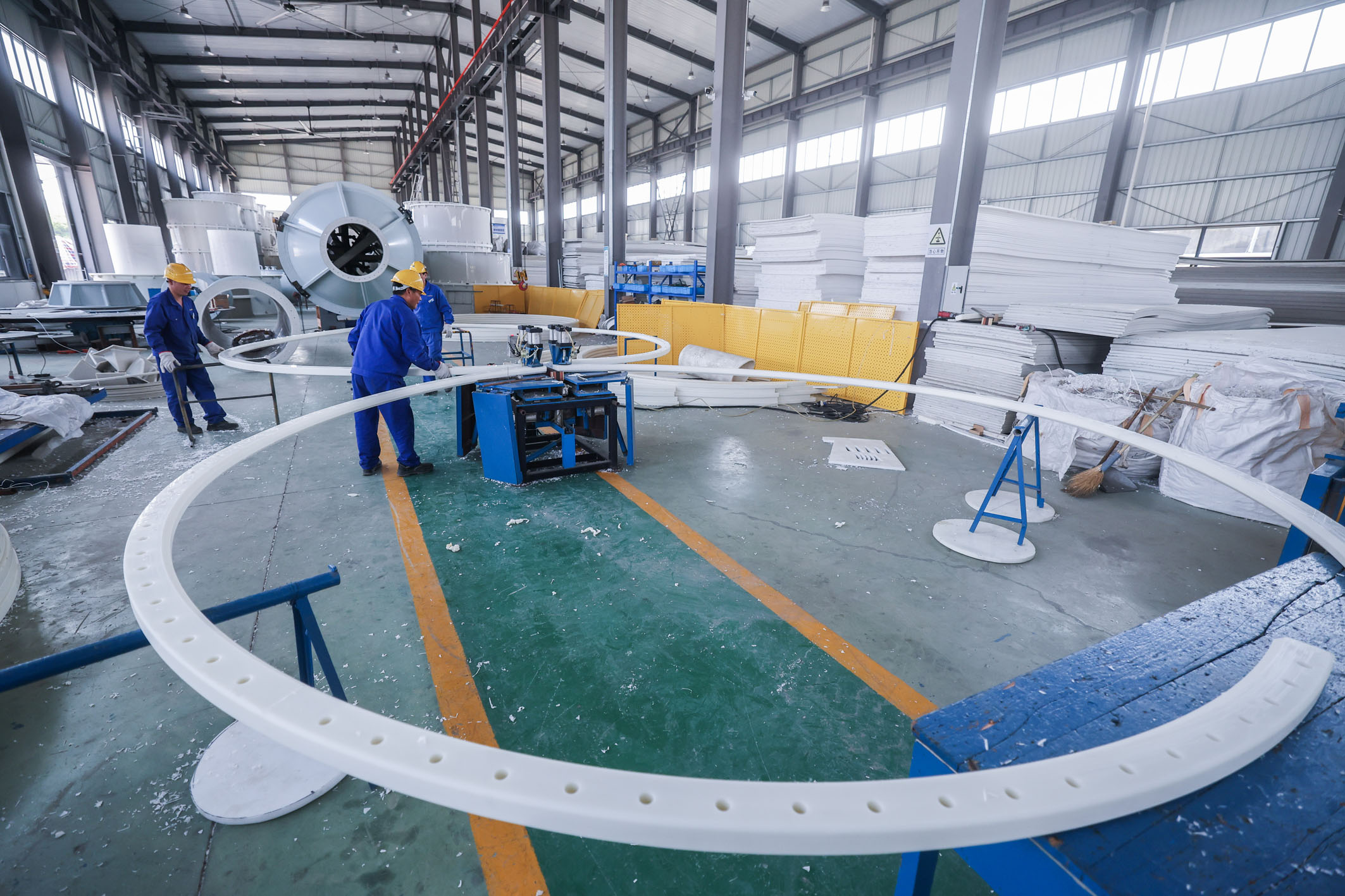 圖為國家專精特新“小巨人”企業(yè)寧波太極環(huán)保設(shè)備有限公司車間內(nèi),工人在生產(chǎn)、組裝銷往東南亞的環(huán)保設(shè)備。