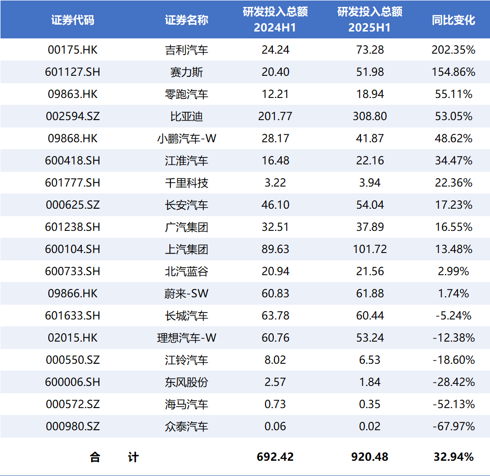 在乘用車市場(chǎng)競(jìng)爭(zhēng)激烈之際,上市車企正試圖在盈利水平與研發(fā)投入之間找到平衡點(diǎn)。同花順iFinD數(shù)據(jù)顯示,截至9月2日,已披露的18家上市車企(A股+H股)今年上半年研發(fā)投入(費(fèi)用化研發(fā)支出+資本化研發(fā)支出)合計(jì)920.48億元,同比增長(zhǎng)32.94%。受車企盈利能力等因素影響,車企研發(fā)投入強(qiáng)度出現(xiàn)分化,納入統(tǒng)計(jì)的18家車企中,12家車企的研發(fā)投入同比實(shí)現(xiàn)正增長(zhǎng),占比為66.67%,吉利汽車(00175.HK)、賽力斯(601127.SH)、零跑汽車(09863.HK)等公司研發(fā)投入同比增幅居前,而長(zhǎng)城汽車(601633.SH)、理想汽車(02015.HK)等車企研發(fā)投入同比減少。