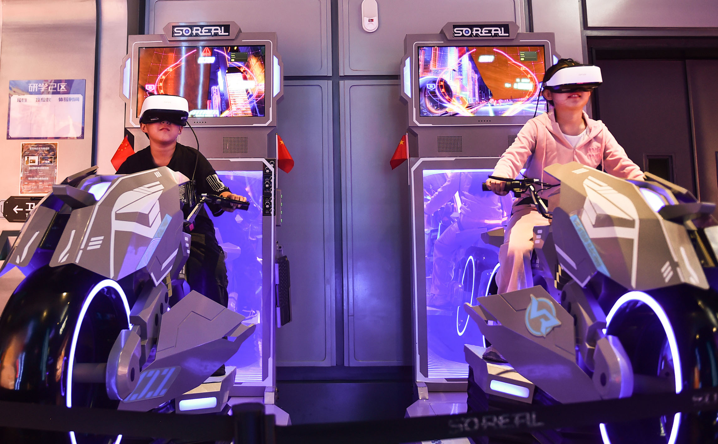 近日,在河南省洛陽(yáng)市澗西區(qū)未來(lái)城科幻樂(lè)園內(nèi),孩子們?cè)隗w驗(yàn)VR虛擬技術(shù)沉浸式場(chǎng)景。新華社發(fā)(黃政偉 攝)
