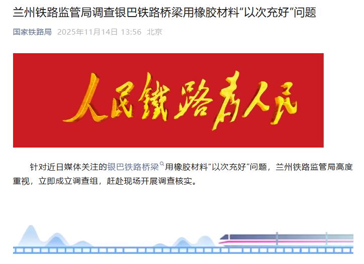 11月14日,國家鐵路局發(fā)布消息稱,蘭州鐵路監(jiān)管局立即成立調(diào)查組,趕赴現(xiàn)場調(diào)查核實(shí)《經(jīng)濟(jì)參考報(bào)》此前報(bào)道的銀巴鐵路橋梁用橡膠材料“以次充好”問題。
