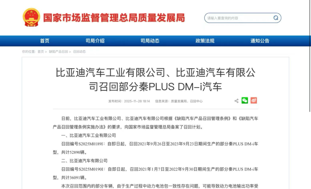 市場(chǎng)監(jiān)管總局網(wǎng)站11月28日消息顯示,日前,比亞迪汽車工業(yè)有限公司、比亞迪汽車有限公司根據(jù)《缺陷汽車產(chǎn)品召回管理?xiàng)l例》和《缺陷汽車產(chǎn)品召回管理?xiàng)l例實(shí)施辦法》的要求,向國(guó)家市場(chǎng)監(jiān)督管理總局備案了召回計(jì)劃,決定自即日起召回部分秦PLUS DM-i車型,共計(jì)88981輛。具體來看: