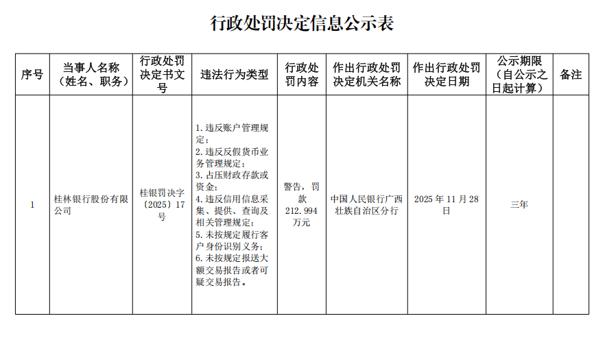 Wind數(shù)據(jù)顯示,2025年三季度以來(lái),桂林銀行已被監(jiān)管點(diǎn)名4次:今年9月,桂林銀行股份有限公司梧州分行因貸款風(fēng)險(xiǎn)分類不準(zhǔn)確、貸后管理不盡職,被國(guó)家金融監(jiān)督管理總局梧州監(jiān)管分局罰款50萬(wàn)元;今年10月,因基金銷售業(yè)務(wù)存在業(yè)務(wù)負(fù)責(zé)人等未取得基金從業(yè)資格,未對(duì)宣傳海報(bào)出具合規(guī)意見書以及個(gè)別基金銷售宣傳海報(bào)未突出風(fēng)險(xiǎn)提示等情況,被證監(jiān)會(huì)廣西監(jiān)管局采取出具警示函的行政監(jiān)管措施;11月24日,桂林銀行股份有限公司賀州分行因違反外匯登記管理規(guī)定,被國(guó)家外匯管理局賀州市分局罰款5萬(wàn)元;11月28日,桂林銀行桂林分行因違反外匯登記管理規(guī)定,被國(guó)家外匯管理局廣西分局罰款10萬(wàn)元。