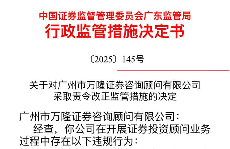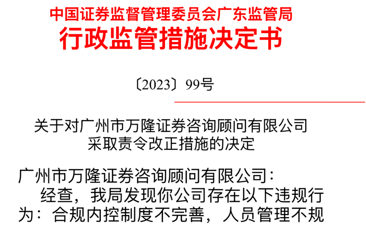 近日,中國證券監(jiān)督管理委員會(huì)廣東監(jiān)管局(以下簡(jiǎn)稱“中國證監(jiān)會(huì)廣東監(jiān)管局”)官網(wǎng)發(fā)布行政監(jiān)管措施決定書,廣州市萬隆證券咨詢顧問有限公司(以下簡(jiǎn)稱“萬隆證券”)被采取責(zé)令改正監(jiān)管措施。