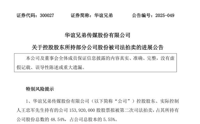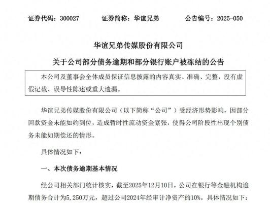 12月10日,華誼兄弟(300027.SZ)發(fā)布公告披露,截至當(dāng)日公司在金融機(jī)構(gòu)的逾期債務(wù)合計(jì)達(dá)5250萬(wàn)元,該金額已超過(guò)其2024年經(jīng)審計(jì)凈資產(chǎn)的10%,同時(shí)公司部分銀行賬戶被凍結(jié)約人民幣64萬(wàn)余元及少量美元。公告同時(shí)透露,公司正通過(guò)與金融機(jī)構(gòu)協(xié)商續(xù)貸、處置非核心資產(chǎn)等方式化解危機(jī)。