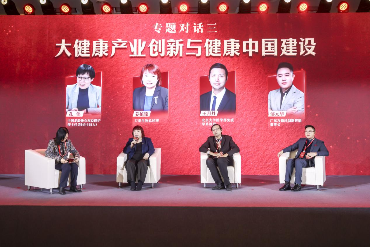在“大健康產(chǎn)業(yè)創(chuàng)新與健康中國建設”專題對話中,中國老齡協(xié)會權益保護部主任孔偉、萬泰生物總經(jīng)理姜植銘、北京大學醫(yī)學部免疫學系教授王月丹、廣東萬德昌創(chuàng)新智能董事長鄒元華圍繞生物疫苗研發(fā)、免疫力管理、智能健康硬件應用等核心議題進行了深入研討,為大健康產(chǎn)業(yè)創(chuàng)新與健康中國建設貢獻智慧。