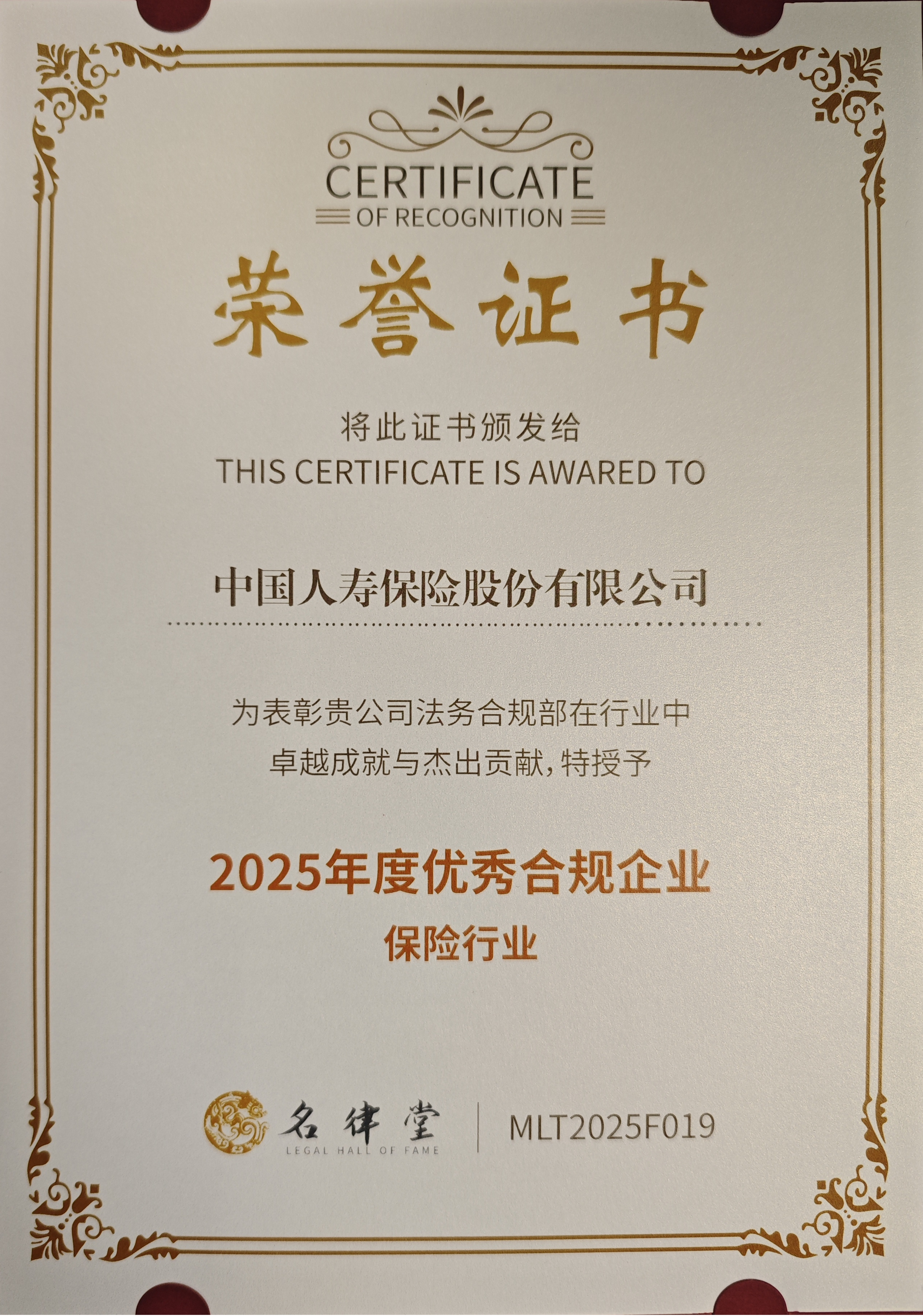 近日,在國內(nèi)法律行業(yè)交流平臺名律堂組織的“2025年企業(yè)合規(guī)先鋒榜”評選項(xiàng)目中,中國人壽保險(xiǎn)股份有限公司(簡稱“中國人壽”,601628.SH,2628.HK)榮獲保險(xiǎn)行業(yè)“2025年度優(yōu)秀合規(guī)企業(yè)”。