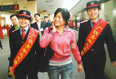 3月1日,全國(guó)人大代表文花枝(中)在長(zhǎng)沙火車(chē)站受到青年的歡迎。楊抒懷