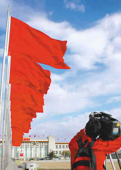 3月2日,北京天安門(mén)廣場(chǎng)到處紅旗飄揚(yáng)。一位記者在廣場(chǎng)拍攝。陳志剛