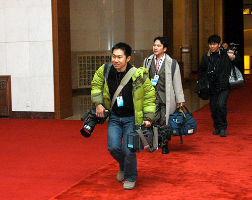 3月5日上午9時(shí),第十一屆全國(guó)人民代表大會(huì)第一次會(huì)議在人民大會(huì)堂開幕,聽取國(guó)務(wù)院總理溫家寶作政府工作報(bào)告,審查年度計(jì)劃報(bào)告和預(yù)算報(bào)告。圖為外國(guó)記者在報(bào)到。新華網(wǎng) 陳競(jìng)超 攝