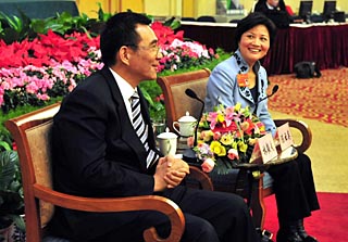 | 3月7日,全國人大代表林毅夫(左)、陳云英在十一屆全國人大一次會議、全國政協(xié)十一屆一次會議新聞中心共同接受記者采訪。新華社記者