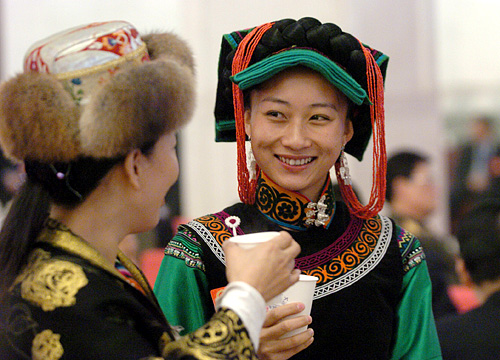 2008年3月10日上午9時(shí),第十一屆全國(guó)人民代表大會(huì)第一次會(huì)議在人民大會(huì)堂舉行第三次全體會(huì)議,聽(tīng)取最高人民法院院長(zhǎng)肖揚(yáng)作最高人民法院工作報(bào)告;聽(tīng)取最高人民檢察院檢察長(zhǎng)賈春旺作最高人民檢察院工作報(bào)告。圖為大會(huì)開(kāi)始前兩位代表在交談。 |