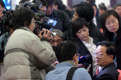 2008年3月10日上午9時(shí),第十一屆全國(guó)人民代表大會(huì)第一次會(huì)議在人民大會(huì)堂舉行第三次全體會(huì)議,聽(tīng)取最高人民法院院長(zhǎng)肖揚(yáng)作最高人民法院工作報(bào)告;聽(tīng)取最高人民檢察院檢察長(zhǎng)賈春旺作最高人民檢察院工作報(bào)告。圖為大會(huì)開(kāi)始前記者采訪人大代表。 |