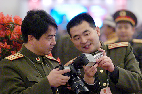 2008年3月10日上午9時(shí),第十一屆全國(guó)人民代表大會(huì)第一次會(huì)議在人民大會(huì)堂舉行第三次全體會(huì)議,聽(tīng)取最高人民法院院長(zhǎng)肖揚(yáng)作最高人民法院工作報(bào)告;聽(tīng)取最高人民檢察院檢察長(zhǎng)賈春旺作最高人民檢察院工作報(bào)告。圖為兩位解放軍代表團(tuán)工作人員在查看照片。 |