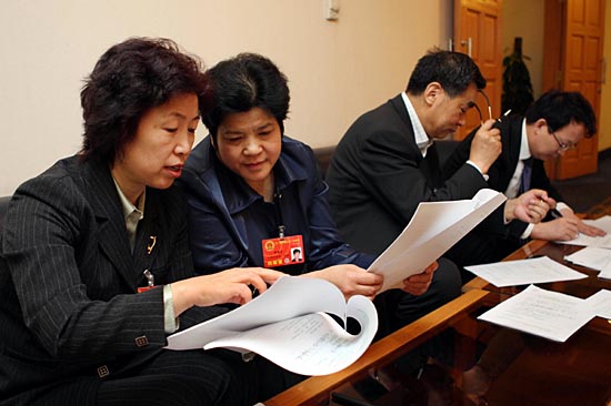 3月11日,來(lái)自山西省的全國(guó)人大代表郭新志(左二)向全國(guó)人大代表、山西省監(jiān)察廳副廳長(zhǎng)劉蓉華(左一)介紹她將向大會(huì)提交的有關(guān)改善基層勞動(dòng)模范待遇以及保障殘疾兒童生活的建議,請(qǐng)劉蓉華復(fù)議。
