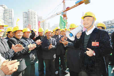 3月13日,十一屆全國(guó)人大一次會(huì)議代表休息日。上午9點(diǎn)多,來(lái)自河南的全國(guó)人大代表、相聲演員范軍來(lái)到位于北京市北三環(huán)的一處工地,看望在這里打工的河南籍民工,了解他們的生活、工作情況,并收集創(chuàng)作素材。趁著工友們午休時(shí)候,范軍代表還即興表演了幾個(gè)相聲段子,把大伙逗得開(kāi)懷大笑。