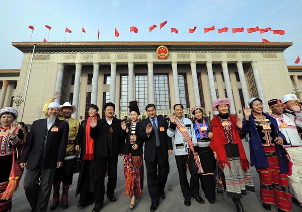 3月14日,中國人民政治協(xié)商會(huì)議第十一屆全國委員會(huì)第一次會(huì)議在北京人民大會(huì)堂閉幕。這是來自云南的委員在人民大會(huì)堂前合影。新華社記者 楊宗友 攝