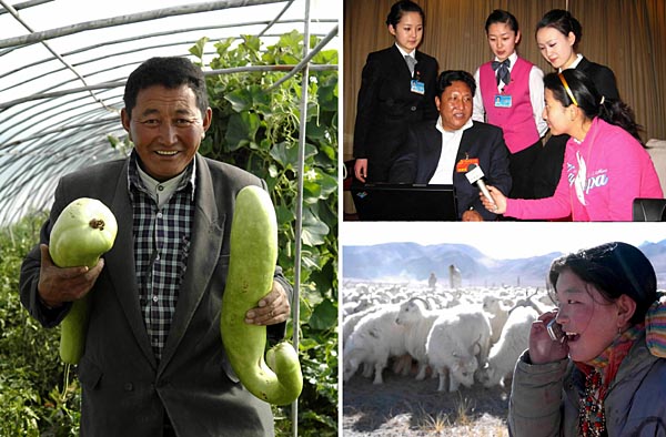 “阿里也有西瓜、蘋果?”聽了達娃扎西代表的介紹,在場的人無不感到驚奇。 面積34萬平方公里、人口僅8萬多的西藏阿里地區(qū)平均海拔5000米以上,因離“天”最近而被稱為“天上的阿里”。但因它寒冷缺氧、環(huán)境惡劣,長久以來又被稱為“生命禁區(qū)”。然而,阿里行署專員達娃扎西代表卻用事實告訴人們:如今,阿里與全國一樣發(fā)生了巨大變化。 聽說達娃扎西代表要向記者介紹“天上的阿里”,一些賓館工作人員也好奇地聚集過來。 “去年阿里地區(qū)農(nóng)牧民西瓜、蘋果的收入就有100多萬元!边_娃扎西介紹,近年來阿里大力發(fā)展白絨山羊養(yǎng)殖、神山圣湖礦泉水生產(chǎn)、無公害果蔬種植,以及旅游業(yè)、特色優(yōu)礦產(chǎn)業(yè)開發(fā)等,去年地區(qū)生產(chǎn)總值突破14億元,比5年前增加了兩倍,農(nóng)牧民人均純收入連續(xù)5年保持兩位數(shù)增長,去年達到2483元。 “你們看,這就是白絨山羊,一只羊的毛絨能賣2000多元,全地區(qū)1100多個示范戶光靠這‘軟黃金’去年總收入就有3億多元!边_娃扎西點擊著電腦上的一張張圖片介紹說,古格王國遺址、扎達土林風光、神山圣湖等古跡和自然美景也吸引著越來越多的游客。農(nóng)牧民通過牦牛運輸、家庭旅館等方式也賺了不少“現(xiàn)票票”。 “我們阿里生存環(huán)境相對來說是有點苦,但在全國人民的關(guān)心幫助下,日子越過越有希望!边_娃扎西說,“隨著阿里機場的興建、新藏公路的改擴建等大型工程上馬,阿里會迎來更大的變化,群眾也將會有更多的致富機會! “真是想不到,阿里竟然這么美,群眾也過上了好日子!睅酌e館工作人員嘖嘖稱奇。 聽到這話,達娃扎西高興地說:“我代表阿里人民歡迎大家來阿里觀光!” 右上圖:全國人大代表達娃扎西在介紹阿里發(fā)生的巨大變化。 右下圖:西藏阿里地區(qū)日土縣藏族牧羊女次仁珠吉放牧著被譽為能產(chǎn)“軟黃金”的白絨山羊(資料照片)。 左圖:西藏阿里地區(qū)普蘭縣農(nóng)民歐珠在展示海拔3800多米的太陽能溫室種出的蔬菜(資料照片)。 |