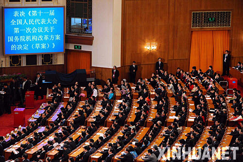 “贊成2744票……” 人民大會(huì)堂大禮堂,主席臺(tái)兩側(cè)的藍(lán)色電子屏幕上,清晰地顯示出由一組數(shù)字組成的表決結(jié)果。 時(shí)間定格在2008年3月15日上午9時(shí)06分。十一屆全國人大一次會(huì)議第五次全體會(huì)議正在舉行。 “通過!” 隨著主持會(huì)議的大會(huì)執(zhí)行主席、主席團(tuán)常務(wù)主席王兆國一聲宣布,最高國家權(quán)力機(jī)關(guān)高票通過關(guān)于國務(wù)院機(jī)構(gòu)改革方案的決定,批準(zhǔn)了新時(shí)期以來的第6次國務(wù)院機(jī)構(gòu)改革方案。 熱烈的掌聲在大禮堂響起…… 這是對(duì)改革方案的肯定,更寄托著對(duì)加快行政管理體制改革、建設(shè)服務(wù)型政府的殷切期盼。 從1982年到2003年,改革開放以來5輪大規(guī)模的機(jī)構(gòu)改革,勾勒了行政管理體制改革推進(jìn)的軌跡。 張少軍代表感慨地說:“每一次改革,都是一次深化。雖然我國現(xiàn)行行政管理體制基本適應(yīng)經(jīng)濟(jì)社會(huì)發(fā)展的要求,但政府機(jī)構(gòu)和政府職能仍然存在諸多與新形勢(shì)新任務(wù)不相適應(yīng)的方面,特別是與深入貫徹落實(shí)科學(xué)發(fā)展觀、構(gòu)建社會(huì)主義和諧社會(huì)等重大戰(zhàn)略思想的要求還存在較大差距! “加快行政管理體制改革,建設(shè)服務(wù)型政府”——黨的十七大明確提出深化行政管理體制改革的總要求。 “到2020年建立起比較完善的中國特色社會(huì)主義行政管理體制”——黨的十七屆二中全會(huì)描繪了深化行政管理體制改革的總目標(biāo)。 逐字研讀,熱烈探討,坦誠直言……大會(huì)期間,代表們對(duì)國務(wù)院機(jī)構(gòu)改革方案進(jìn)行了認(rèn)真審議。 加強(qiáng)和改善宏觀調(diào)控,促進(jìn)科學(xué)發(fā)展;著眼于保障和改善民生,加強(qiáng)社會(huì)管理和公共服務(wù);按照探索職能有機(jī)統(tǒng)一的大部門體制要求,對(duì)一些職能相近的部門進(jìn)行整合——此次改革突出的三個(gè)重點(diǎn),獲得代表們的普遍認(rèn)可。 “這些重點(diǎn),抓住了當(dāng)前深化行政管理體制改革的關(guān)鍵,體現(xiàn)了科學(xué)發(fā)展觀的要求!标惷鼬Q代表說。 對(duì)新一輪國務(wù)院機(jī)構(gòu)改革,代表們充滿期待—— “今年是全面貫徹落實(shí)黨的十七大戰(zhàn)略部署的第一年。要按照大會(huì)通過的方案,積極穩(wěn)妥地推進(jìn)國務(wù)院機(jī)構(gòu)改革,確保行政管理體制改革順利進(jìn)行!绷治浯肀硎。 “要按照決策權(quán)、執(zhí)行權(quán)、監(jiān)督權(quán)既相互制約又相互協(xié)調(diào)的要求,著力優(yōu)化組織結(jié)構(gòu),規(guī)范機(jī)構(gòu)設(shè)置,完善運(yùn)行機(jī)制,為全面建設(shè)小康社會(huì)提供組織保障!备实烂鞔碚J(rèn)為。 新一輪國務(wù)院機(jī)構(gòu)改革大幕已啟!凹訌(qiáng)領(lǐng)導(dǎo),周密部署,保證機(jī)構(gòu)改革方案的順利實(shí)施”——大會(huì)決定中的這段話,道出了億萬人民共同的心聲!