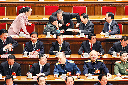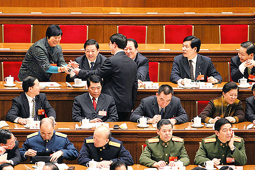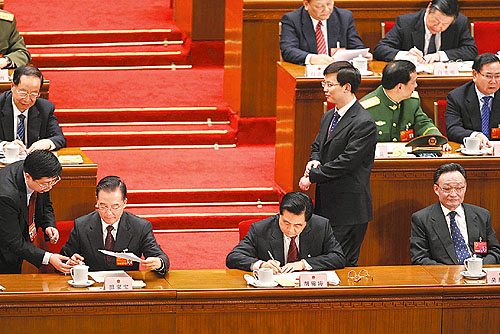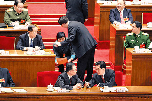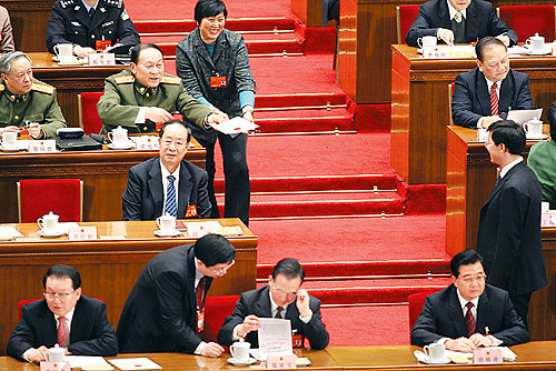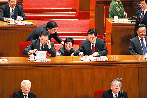 ①3月17日15時(shí)36分,監(jiān)票人員正在統(tǒng)計(jì)選票,大會(huì)稍事休息。一位女代表想請(qǐng)胡錦濤主席簽名,被一位工作人員勸阻。這位女代表叫謝木蘭,是江西省余干縣瑞洪鎮(zhèn)鎮(zhèn)郊村婦女主任?吹胶\濤和溫家寶正在交談,謝木蘭仍不想放棄這次機(jī)會(huì)。