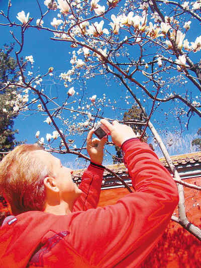湛藍的天空,盛開的白玉蘭,給兩會增添了喜慶氣氛。