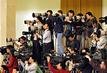 | 3月18日,國務(wù)院總理溫家寶和副總理李克強(qiáng)、回良玉、張德江、王岐山在北京人民大會堂與中外記者見面,并回答記者提問。這是攝影、攝像記者在現(xiàn)場采訪拍攝。新華社記者