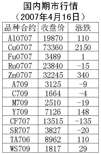 4月16日國(guó)內(nèi)期貨市場(chǎng)金屬價(jià)格上漲。倫敦銅上周五上漲72.5美元/噸,收盤7732.5美元/噸。滬銅707合約周一上漲2150元/噸,收盤73360元/噸。