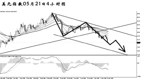由于近期投資者開始對全球經(jīng)濟復蘇的預期進行重新思考,市場避險情緒重新占據(jù)了上風,美元指數(shù)在創(chuàng)下4個月新低后展開反彈,并終結(jié)了連續(xù)三周的下跌走勢。 然而,美國公布的第一季度NAR房價年率下跌14%,跌幅創(chuàng)紀錄新高,4月零售銷售也意外下滑,而且初請失業(yè)金人數(shù)的增幅也超出預期,美國股市因此受到?jīng)_擊。上周道指總計下跌3.6%,標普500指數(shù)下挫5%,為近兩個月表現(xiàn)最差的一周,納指下滑3.4%,結(jié)束了周K線的“九連陽”。此外,費城聯(lián)儲上周公布的調(diào)查結(jié)果顯示,美國第三季度GDP預計將增長0.4%,此前預期為增長1.0%,這表明經(jīng)濟復蘇的步伐將較此前預估的更為緩慢。 受上述因素影響,美元指數(shù)在跌破82.60的支撐后小幅調(diào)整,隨即加速下行,延續(xù)了短線良好的下跌主趨勢。從空間上看,下方除了去年底的低點77.60外已無明顯的強支撐。短線美元指數(shù)在均線系統(tǒng)的壓制下一路走低,斜率陡峭,且形成了一個新的下降通道。預計下周美元指數(shù)修正后將延續(xù)弱勢,仍以看空美元指數(shù)為主思路。