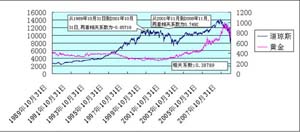 由圖中可知,從1989年到2001年,黃金與道瓊斯是高負相關性,相關系數(shù)是-0.85719,股市處于大牛市狀態(tài),而黃金價格卻在熊市中。之所以會是負的相關性,我們可以從資金流向得知:由于信息產(chǎn)業(yè)化及中國等新型發(fā)展國家的國際貿易體系不斷完善,使美國的經(jīng)濟數(shù)據(jù)不斷出現(xiàn)利好消息,大家對經(jīng)濟前景看好,因此,股市投資熱情高漲,大量資金涌入股市,從而,作為避險資產(chǎn)的黃金自然就少了需求,股市大漲,而黃金價格下跌。
