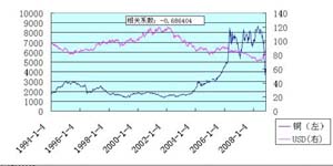 圖2是LME銅與美元的相關系數(shù)圖,數(shù)據(jù)記錄是從1994年1月到2008年12月。