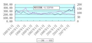 圖4是CRB與美元的相關系數(shù)圖,數(shù)據(jù)記錄是從1980年1月份到2008年底,它們的相關系數(shù)是-0.329789,是呈負的相關性。