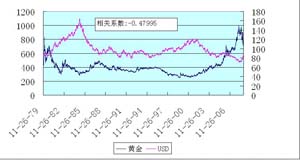 圖5是美元與黃金的相關性曲線,數(shù)據(jù)記錄了1979年11月到2008年12月間的關聯(lián)性,其中,它們的相關系數(shù)為-0.47995,是負的相關性。
