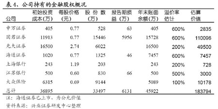 興業(yè)證券的研究報告稱,由于國企的優(yōu)勢,大眾交通擁有了多家金融機構(gòu)和上海較好企業(yè)的法人股,該部分資產(chǎn)的公允價值大大高于賬面價值。大眾交通現(xiàn)有賬面價值4.59億元的金融機構(gòu)股權(quán),其中海通證券已上市,價值7457萬,其余為國泰君安、光大證券等非上市證券公司,依照海通證券的溢價情況,粗略估計大眾交通金融股權(quán)的溢價為3倍左右,相當(dāng)于增加資產(chǎn)價值13.7億,每股價值0.87元。