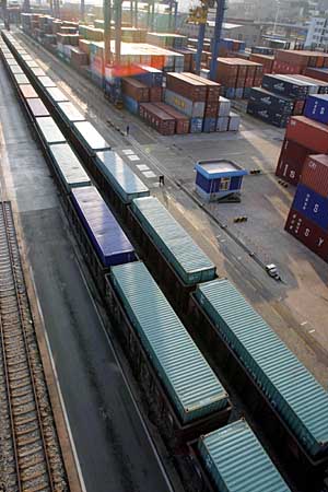 10月9日,連云港至莫斯科的國際鐵路集裝箱班列啟程。當(dāng)日,中海集團與中鐵集運公司聯(lián)手開通中國連云港至俄羅斯莫斯科的國際鐵路集裝箱班列,使新亞歐大陸橋過境集裝箱直達運輸首次由中亞延伸到歐洲。首次開通的連云港至莫斯科的國際鐵路集裝箱運輸班列有“五定”:定點、定線、定時、定距、定價,每列共有48個車廂,可裝載96個國際標(biāo)準集裝箱,沿新亞歐大陸橋運輸25天可到達俄羅斯。