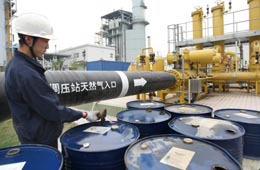 位于河南鄭州高新技術(shù)產(chǎn)業(yè)開(kāi)發(fā)區(qū)的鄭州燃?xì)怆娬,是一個(gè)以天然氣為能源的發(fā)電站,2007年1月建成并網(wǎng)發(fā)電。截至9月30日,該電站累計(jì)發(fā)電7.5584億千瓦時(shí),不僅成為華中電網(wǎng)的重要電源支撐點(diǎn),提高了調(diào)峰能力,也使河南省的電源結(jié)構(gòu)和中心城市的環(huán)境質(zhì)量得到改善。圖為一名工人在鄭州燃?xì)怆娬镜奶烊粴庹{(diào)壓站內(nèi)回收天然氣體中殘留的油品。 |