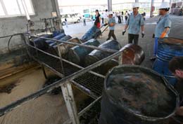 浙江某公司利用餐飲廢油生產(chǎn)柴油工藝,將一桶桶黑糊糊的“地溝油”經(jīng)沉淀、過濾、提純等系列工序后,變成了清潔環(huán)保的生物柴油。 | “高油價(jià)”背景下,就在河北不少地區(qū)加緊開工建設(shè)生物柴油項(xiàng)目時(shí),3家已建成投產(chǎn)的生物柴油加工企業(yè)日前卻向記者反映,所需要的黃連木籽、泔水油、地溝油等原材料供應(yīng)不足,導(dǎo)致無法達(dá)到預(yù)期產(chǎn)能。他們認(rèn)為,這些表面看上去十分豐富的廢棄物,由于回收組織化程度低,并不能源源不斷地輸送給煉油企業(yè);此外,一些專家表示,由于目前廢棄油脂處理處于無序狀態(tài),廢棄油脂流向令人擔(dān)憂,這一系列問題亟待引起政府重視。
