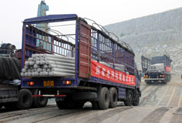湖北省電力公司根據(jù)國家電網(wǎng)公司要求,急調(diào)5500根水泥電線桿經(jīng)水路運(yùn)往四川災(zāi)區(qū),維修受損電網(wǎng)。為了讓這批救災(zāi)物資順利進(jìn)川,三峽有關(guān)部門開通了三峽專用公路放行。5月17日,運(yùn)送電線桿的車隊經(jīng)三峽專用公路抵達(dá)湖北秭歸銀杏沱碼頭,在這里乘滾裝船前往重慶萬州,再經(jīng)陸路運(yùn)達(dá)四川災(zāi)區(qū)。新華社發(fā)(劉保平