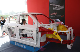 5月24日,中國(guó)汽車(chē)安全主題巡展在長(zhǎng)春文化廣場(chǎng)舉行,展會(huì)上各家廠商分別宣傳演示了自己公司產(chǎn)品在安全方面的特點(diǎn)和優(yōu)勢(shì)。圖為一家廠商在展示車(chē)骨架的安全設(shè)計(jì)。