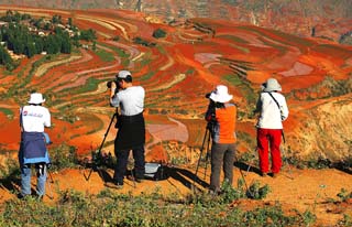 云南東川的紅土地總面積達(dá)20平方公里,一年四季中,洋麥花、蕎子花、油菜花和蘿卜花等交替開(kāi)放,色彩斑斕,成為著名旅游景觀。圖為幾位攝影愛(ài)好者在東川拍攝紅土地。本報(bào)記者:楊牧源