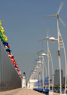青島奧帆中心在場館建設(shè)中倡導(dǎo)“科技奧運、綠色奧運”的理念,大量利用太陽能、風(fēng)能等清潔能源。圖為奧帆中心主防波堤建設(shè)安裝了41盞風(fēng)能燈。新華社記者:宋振平