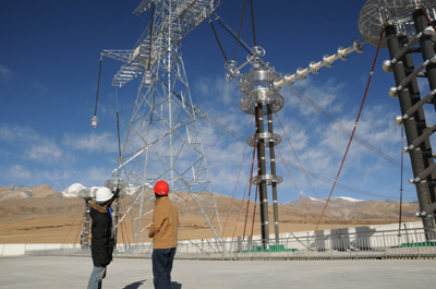國家電網(wǎng)公司西藏高海拔試驗(yàn)研究基地日前在海拔4300米的西藏拉薩市羊八井鎮(zhèn)投入運(yùn)行。西藏電力“高原孤島”狀況有望結(jié)束。圖為電力工作者在檢查+1000kv直流電壓發(fā)生器。
