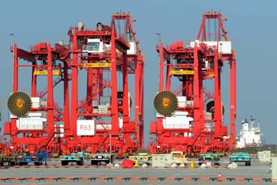 江蘇太倉港蘇州現(xiàn)代貨箱碼頭強(qiáng)化節(jié)能減排,2008年投入8000多萬元對數(shù)十臺柴油動(dòng)力輪胎式集裝箱門吊等港口機(jī)械設(shè)備進(jìn)行“油改電”技術(shù)改造,同時(shí)引進(jìn)新的無污染電動(dòng)設(shè)備,成為全面實(shí)現(xiàn)“油改電”改造的港口碼頭。這一環(huán)保改造工程使該碼頭每年的二氧化碳排放量減少57%,廢油、廢水等廢棄物排放量減少95%,每標(biāo)箱作業(yè)能耗降低50%。圖為經(jīng)過“油改電”改造后的電力集裝箱門吊集結(jié)在碼頭上。 |