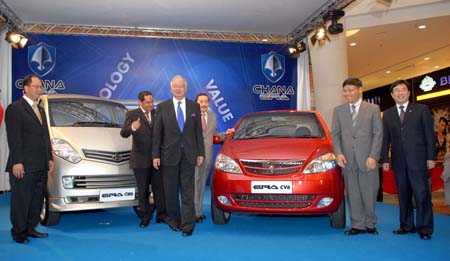 1月19日,馬來西亞副總理納吉布(左三)和中國駐馬來西亞大使劉健(右二)在吉隆坡時(shí)代廣場欣賞長安汽車。當(dāng)日,長安汽車首次在馬來西亞推出兩款車型,希望使馬來西亞消費(fèi)者也能享受到物美價(jià)廉的中國汽車。