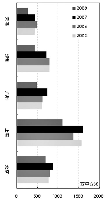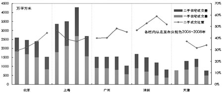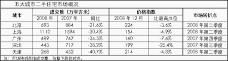 ●根據(jù)中原地產(chǎn)研究中心統(tǒng)計,2008年全年五大城市二手住宅總成交面積僅3003萬平方米,較2007年下降31.6%,也是最近四年來的最低水平,市場低迷可見一斑。 ●從區(qū)域來看,珠三角城市萎縮較為嚴(yán)重,廣州和深圳2008年二手住宅成交量分別同比下跌34.5%和38.2%。而全國其他主要區(qū)域二手住宅市場亦有不同程度回落。 ●在珠三角城市帶領(lǐng)下,北京、上海和天津的二手房價在2008年第二季度開始出現(xiàn)下滑。第四季度起,受宏觀經(jīng)濟和金融危機的影響,價格下調(diào)速度有所加快。