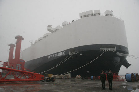 由威海三進(jìn)船業(yè)有限公司為一家挪威公司建造的“大西洋”號大型汽車運(yùn)輸船于5月11日早上6時進(jìn)行首航,開往韓國仁川港。這艘汽車運(yùn)輸船船長199.90米,寬32.26米,高34.55米,可裝載6700輛汽車。