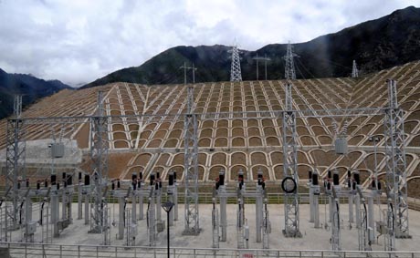 由于國家投資力度的加大,西藏以雅魯藏布江支流上建設電站為主的水電建設進入高峰。目前,西藏已經(jīng)建成藏中電網(wǎng)、林芝電網(wǎng)、昌都電網(wǎng)和獅泉河電網(wǎng)4個區(qū)域性電網(wǎng),到2008年底全區(qū)電力裝機容量達71.6萬千瓦,年發(fā)電量18.45億千瓦。圖為西藏林芝地區(qū)雪卡水電站變電站一角。