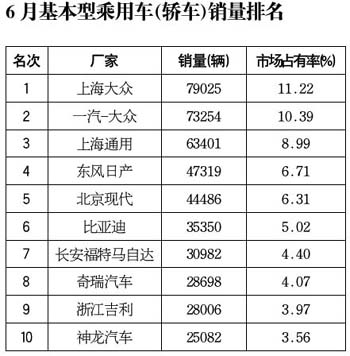 6月,基本型乘用車(轎車)銷售704884輛,環(huán)比下降2.11%,同比增長10.04%。從6月的統(tǒng)計數(shù)據(jù)看,轎車市場“高開低走”的趨勢愈發(fā)明顯,預(yù)計7月份轎車增速還將進(jìn)一步下滑。 從6月份的銷量情況來看,排名前十位的企業(yè)共銷售455603輛,占轎車銷售總量的64.64%。從排名情況看,上海大眾由上月的第三位升為第一位,主要緣于朗逸的旺銷,6月銷售2.15萬輛;而上海通用卻由上月的第一位降為第三位,與凱越的銷售不佳有很大關(guān)系。保持排名不變的只有一汽-大眾一家,其余均有變化,北京現(xiàn)代、比亞迪、奇瑞汽車、浙江吉利、神龍汽車均下降了一位,東風(fēng)日產(chǎn)上升了兩位,而上月墊底的長安福特馬自達(dá)上升到第七位,由于?怂6月銷售1.43萬輛,較上月銷量有一定提高。 6月銷量排名前十位的轎車品牌依次是:朗逸、捷達(dá)、悅動、桑塔納、新寶來、F3、駿捷、夏利、?怂购蛣P越。從月度排名來看,朗逸首次位居第一,與上月相比,F(xiàn)3和凱越排名明顯下滑。