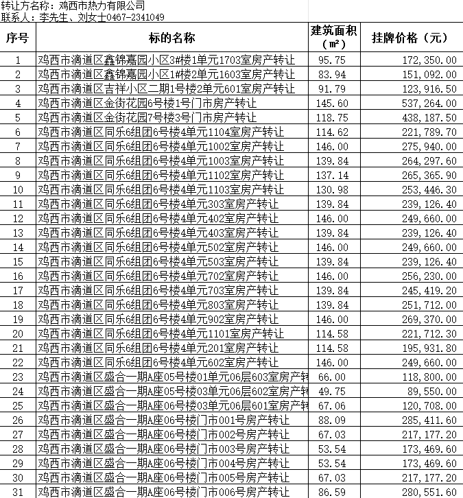 【重點(diǎn)項(xiàng)目】雞西市熱力有限公司57處房產(chǎn)分別轉(zhuǎn)讓