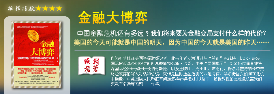 | 如果你覺得自己到現(xiàn)在為止也沒真正搞清楚金融危機與國際金融界到底是怎么一回事,劉洪的這本《金融大博弈——金融戰(zhàn)略下的中國和西方未來》會給你想要的答案。 |