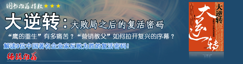 | 對于企業(yè)家而言,失敗只是華彩篇章中一個微不足道的逗號而已。財經(jīng)作家陳潤在他的新書《大逆轉(zhuǎn)》中,就寫了這樣一群不甘心失敗、再戰(zhàn)商業(yè)江湖,又重新獲得人生輝煌的企業(yè)家群體。從書中對這些案例的分析總結(jié),我們可以看見那些歷經(jīng)慘敗卻又從地上爬起來的企業(yè)家們所普遍具有的特質(zhì),那就是:狂野的夢想、粗壯的神經(jīng)、冷靜的反思以及縝密的計劃…[詳細] |